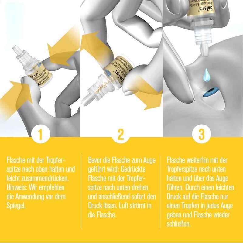 Aufgrund der speziellen Beschaffenheit der EvoTears® Augentropfen ist es möglich, dass Sie den Tropfen im Auge kaum wahrnehmen. In diesem Fall empfiehlt sich das Eintropfen vor dem Spiegel oder das Beobachten der Applikation durch eine zweite Person, bis Sie das Gefühl der Tropfenverteilung auf dem Auge kennengelernt haben.