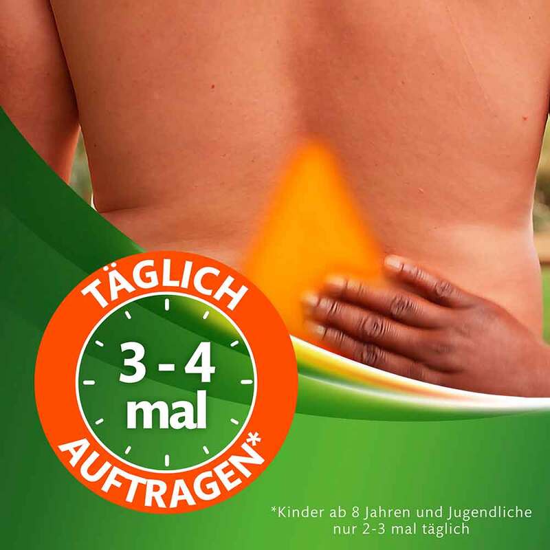 Die Anwendungsdauer richtet sich nach den Symptomen und der zugrundeliegenden Erkrankung. Bei akuten Muskelschmerzen im Bereich des Rückens, Verstauchungen, Prellungen und Zerrungen ist gewöhnlich eine Anwendung über 10 Tage ausreichend; bei Kniegelenksarthrose kann eine Anwendung bis zu 3 Wochen erforderlich sein. Bei Kindern ab 8 Jahren und Jugendlichen nicht länger als 1 Woche anwenden.
