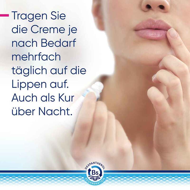 Bei Bedarf – also, wenn sich die Lippen trocken und/oder rissig anfühlen – tragen Sie die Creme auf die strapazierten Lippen auf. Für besonders reichhaltige Pflege können Sie die Bepanthol reichhaltige Lippencreme auch als Kur über Nacht einsetzen. Dazu cremen Sie sie vor dem Schlafengehen besonders sorgfältig ein.