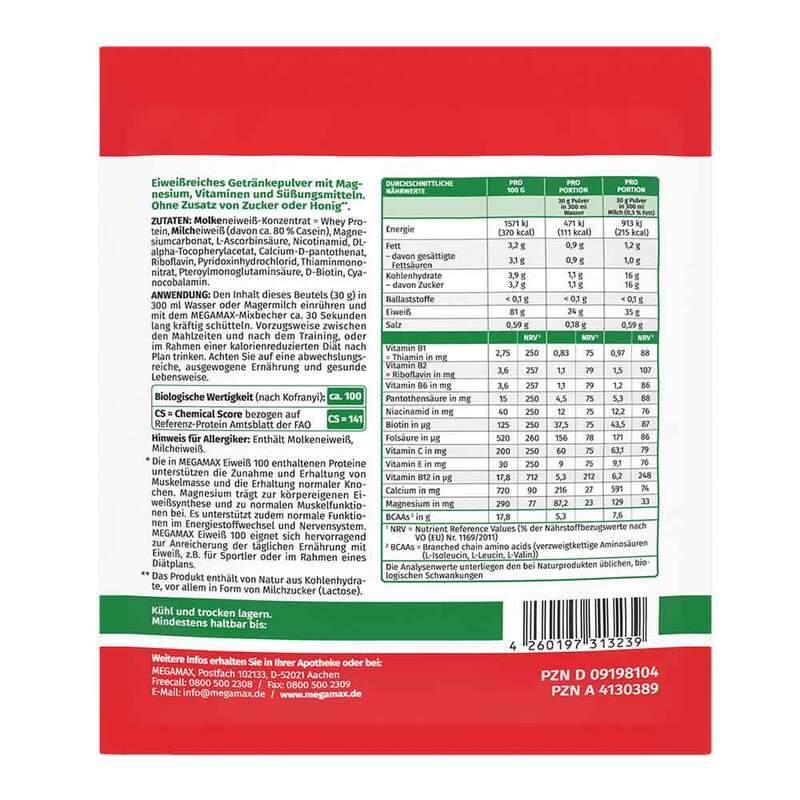 MEGAMAX Eiweiß 100 besteht aus Milcheiweiß und Molkenprotein. Diese Proteine unterstützen Ihren Körper bei der Zunahme und Erhaltung von Muskelmasse und tragen auch zu einer Erhaltung normaler Knochen bei. Daneben enthält MEGAMAX Eiweiß 100 auch eine Auswahl von Vitaminen. Vitamin B12 zum Beispiel trägt zu einem normalen Ablauf Ihres Energiestoffwechsels bei und Vitamin C unterstützt die normale Funktion Ihres Immunsystems während und nach intensiver körperlicher Betätigung.