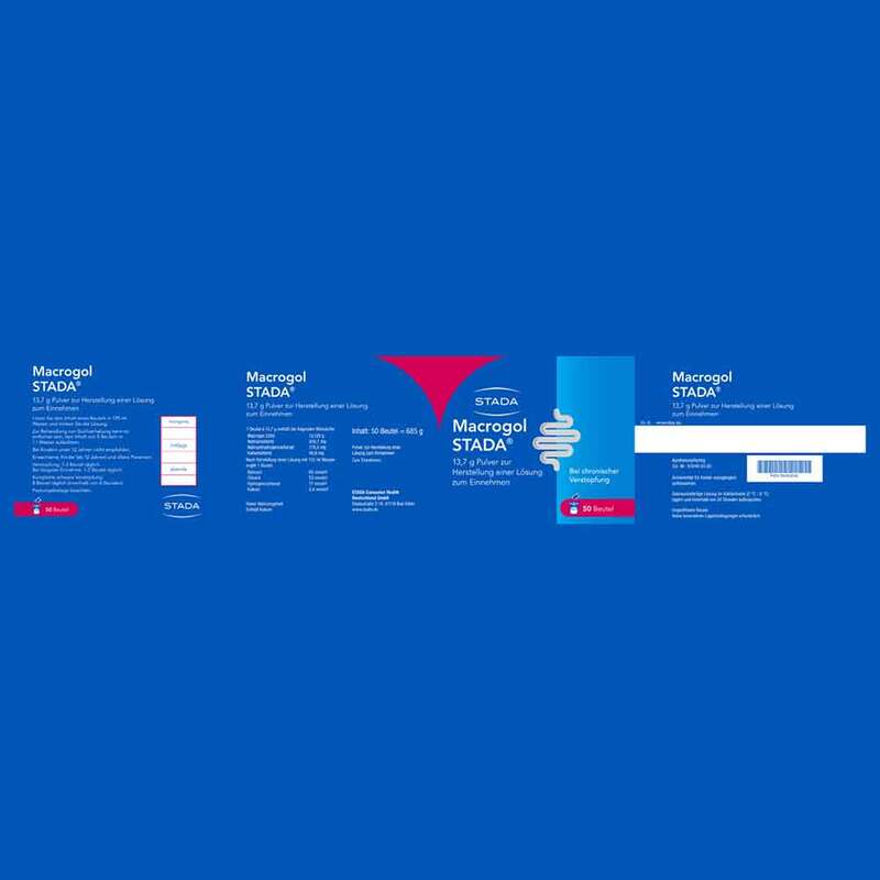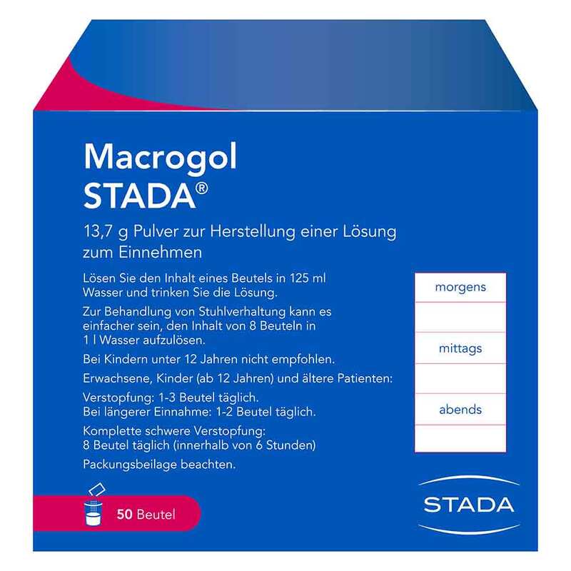 Macrogol STADA® 13,7 g Pulver zur Herstellung einer Lösung zum Einnehmen. Wirkstoffe: Macrogol 3350, Natriumchlorid, Natriumhydrogencarbonat, Kaliumchlorid. Abführmittel zur Behandlung der chronischen Verstopfung bei Erwachsenen, Kindern ab 12 Jahren und älteren Patienten. Es verhilft Ihnen zu einer unproblematischen Darmtätigkeit, selbst wenn Sie bereits über einen langen Zeitraum unter Verstopfung gelitten haben. Es wirkt auch bei einer sehr schlimmen Verstopfung, die als Stuhlverhaltung (komplette schwere Verstopfung) bezeichnet wird. Hinweis: Hoher Natriumgehalt. Enthält Kalium. Bei Kindern unter 12 Jahren nicht empfohlen. Zu Risiken und Nebenwirkungen lesen Sie bitte die Packungsbeilage und fragen Sie Ihren Arzt oder Apotheker. STADA Consumer Health Deutschland GmbH, Stadastraße 2–18, 61118 Bad Vilbel. Stand: November 2022