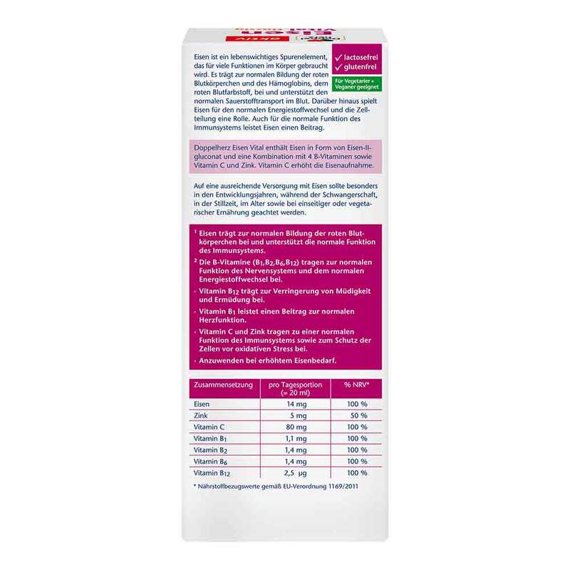 Doppelherz Eisen Vital enthält neben Eisen eine Kombination aus Vitamin C, B-Vitaminen und Zink.