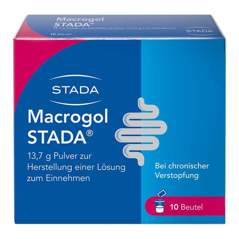 Macrogol STADA® 13,7 g Pulver zur Herstellung einer Lösung zum Einnehmen. Wirkstoffe: Macrogol 3350, Natriumchlorid, Natriumhydrogencarbonat, Kaliumchlorid. Abführmittel zur Behandlung der chronischen Verstopfung bei Erwachsenen, Kindern ab 12 Jahren und älteren Patienten. Es verhilft Ihnen zu einer unproblematischen Darmtätigkeit, selbst wenn Sie bereits über einen langen Zeitraum unter Verstopfung gelitten haben. Es wirkt auch bei einer sehr schlimmen Verstopfung, die als Stuhlverhaltung (komplette schwere Verstopfung) bezeichnet wird. Hinweis: Hoher Natriumgehalt. Enthält Kalium. Bei Kindern unter 12 Jahren nicht empfohlen. Zu Risiken und Nebenwirkungen lesen Sie bitte die Packungsbeilage und fragen Sie Ihren Arzt oder Apotheker. STADA Consumer Health Deutschland GmbH, Stadastraße 2–18, 61118 Bad Vilbel. Stand: November 2022