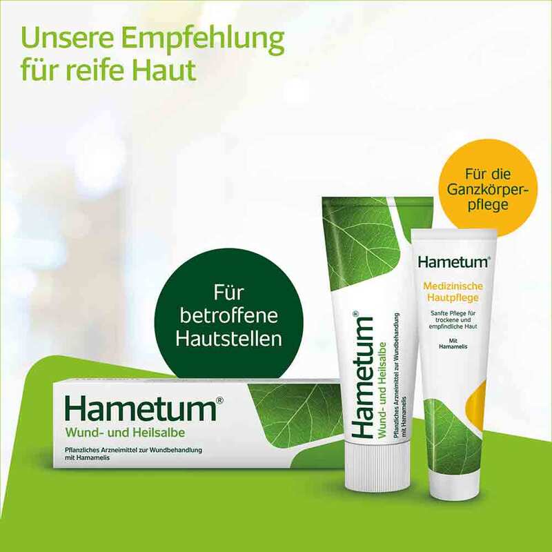 Hametum® Wund- und Heilsalbe. Wirkstoff: Hamamelisdestillat. Anwendungsgebiete: Leichte Hautverletzungen, kleinflächige Entzündungen der Haut und Schleimhäute. Bei großflächigen oder eitrig infizierten Wunden ist die Rücksprache mit einem Arzt erforderlich. Zu Risiken und Nebenwirkungen lesen Sie die Packungsbeilage und fragen Sie Ihre Ärztin, Ihren Arzt oder in Ihrer Apotheke. Dr. Willmar Schwabe GmbH & Co. KG - Karlsruhe