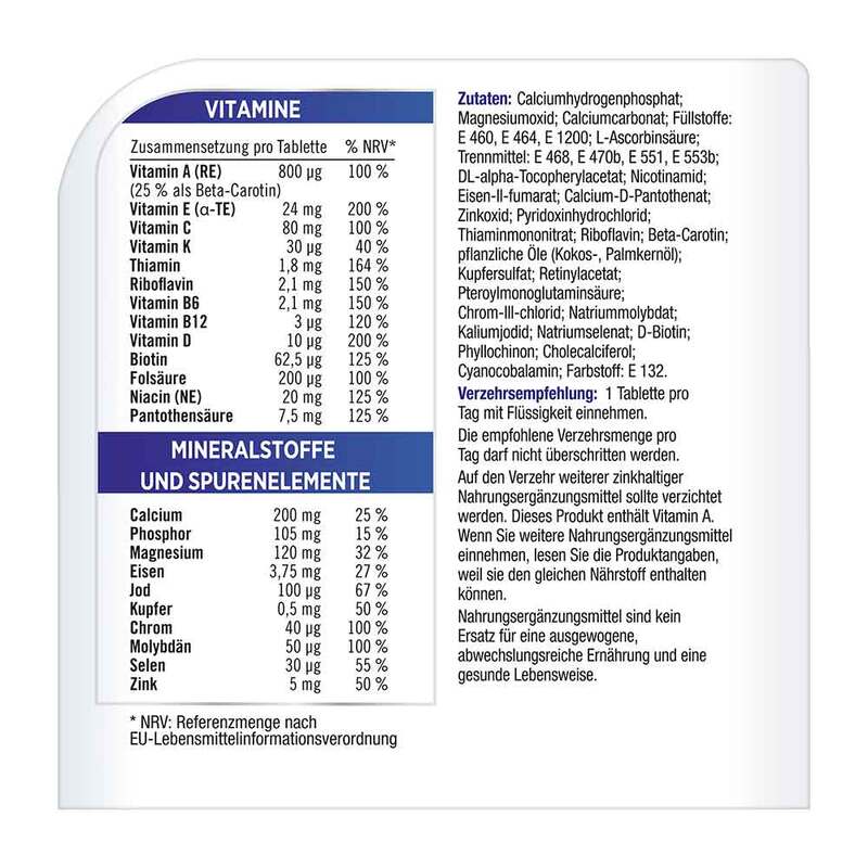 Calciumhydrogenphosphat; Magnesiumoxid; Calciumcarbonat; Füllstoffe: E 460, E 464, E 1200; L-Ascorbinsäure; Trennmittel: E 468, E 470b, E 551, E 553b; DL-alpha-Tocopherylacetat; Nicotinamid; Eisen-II-fumarat; Calcium-D-Pantothenat; Zinkoxid; Pyridoxinhydrochlorid; Thiaminmononitrat; Riboflavin; Beta-Carotin; pflanzliche Öle (Kokos-, Palmkernöl); Kupfersulfat; Retinylacetat; Pteroylmonoglutaminsäure; Chrom-III-chlorid; Natriummolybdat; Kaliumjodid; Natriumselenat; D-Biotin; Phyllochinon; Cholecalciferol; Cyanocobalamin; Farbstoff: E 132.