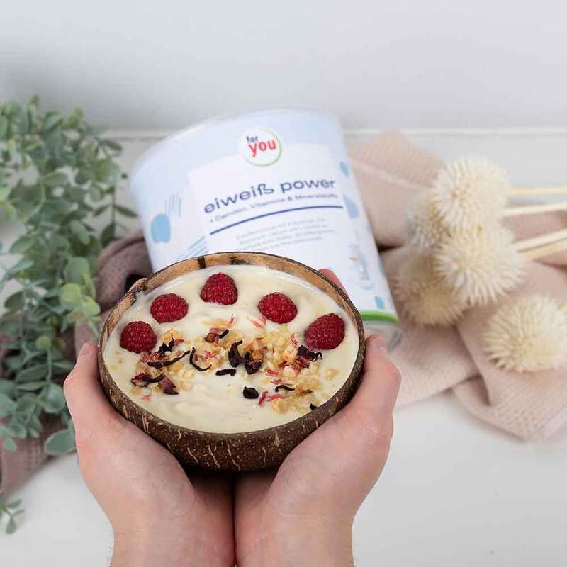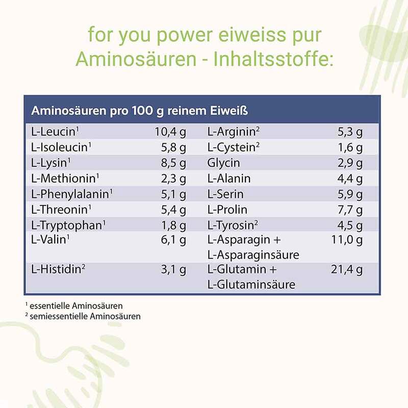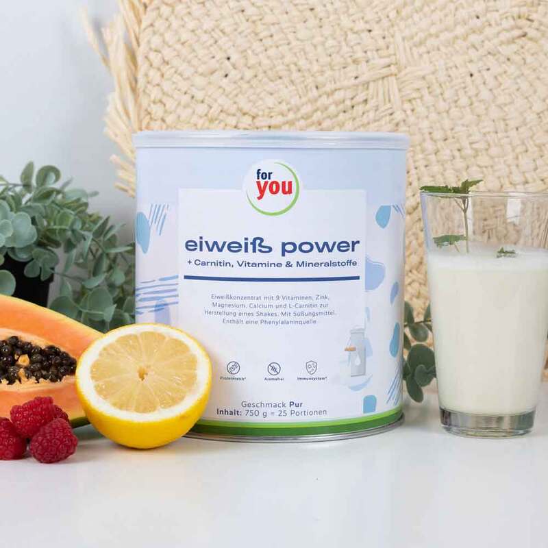 Das Eiweißpulver ist eine Mischung aus vier biologisch sehr hochwertigen Proteinquellen. Es ist gut löslich & fettarm. Durch die Kombination verschiedener Eiweißquellen hat es eine ausgewogene Bilanzierung aller Aminosäuren. For You Eiweiß Power setzt sich aus vier hochwertigen Eiweißkomponenten zusammen.