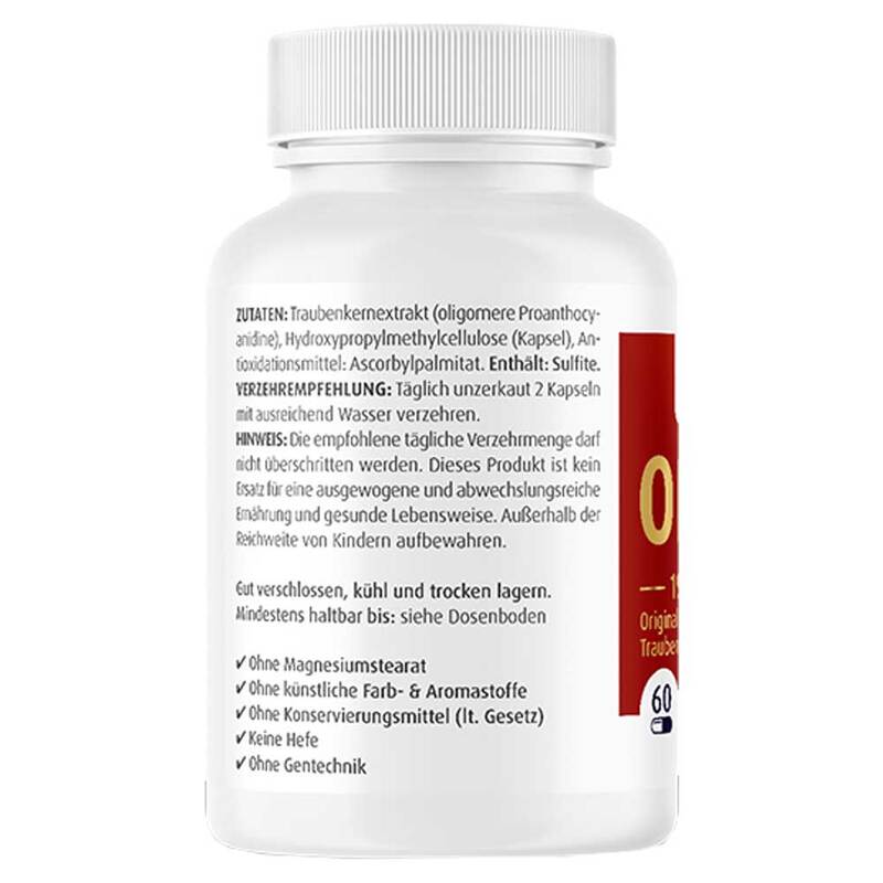 Zutaten: Traubenkernextrakt (oligomere Proanthocyanidine), Hydroxypropylmethylcellulose (Kapsel), Antioxidationsmittel: Ascorbylpalmitat. Enthält: Sulfite.