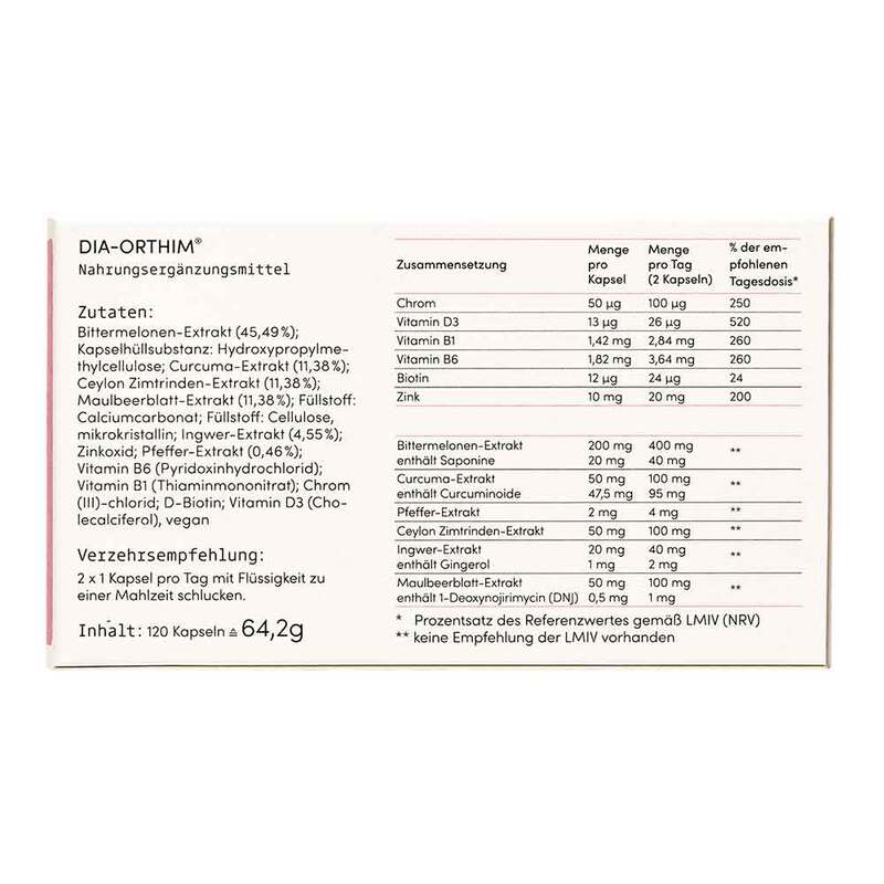 Dia-Orthim besteht aus einer einzigartigen Zusammensetzung und ist frei von Fructose, Gluten und Lactose – einfach und natürlich. Wichtige Inhaltstoffe sind z.B. Bittermelonen-, Curcuma-, Pfeffer-, Ingwer-, Maulbeerblatt- und Ceylon Zimtrinden-Extrakt.