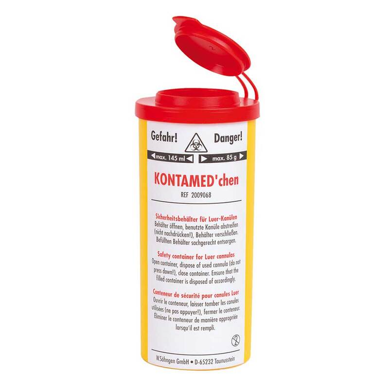 Der kleine Sicherheitsbehälter für unterwegs. Entspricht BGR 250/TRBA 250: Biologische Arbeitsstoffe im Gesundheitswesen und in der Wohlfahrtspflege. KONTAMEDchen ist mit einem Abziehschlitz für Kanülen/Spritzen ausgestattet und hat ein verstärktes Bodenteil, das ein Durchstechen von Kanülen verhindert. KONTAMEDchen passt noch in alle Arzttaschen und Notfallkoffer, sogar in die Kitteltasche - eine praktische und sichere Lösung für "unterwegs".