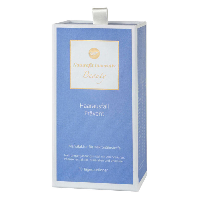 Haarausfall Prävent von Naturafit Innovativ Beauty aus der Manufaktur für Mikronährstoffe in Deutschland beinhaltet eine Spezialformel aus über 20 verschiedenen Mikronährstoffen. Sie kann als Vorbeugung gegen künftigen Haarverlust und bei Haarausfall verwendet werden.