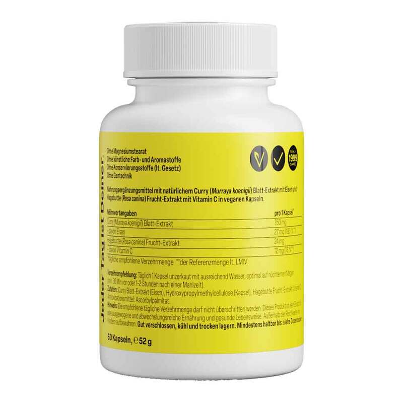 Curry Blatt-Extrakt (Eisen), Hydroxypropylmethylcellulose (Kapsel), Hagebutte Frucht-Extrakt (Vitamin C), Antioxidationsmittel: Ascorbylpalmitat.
