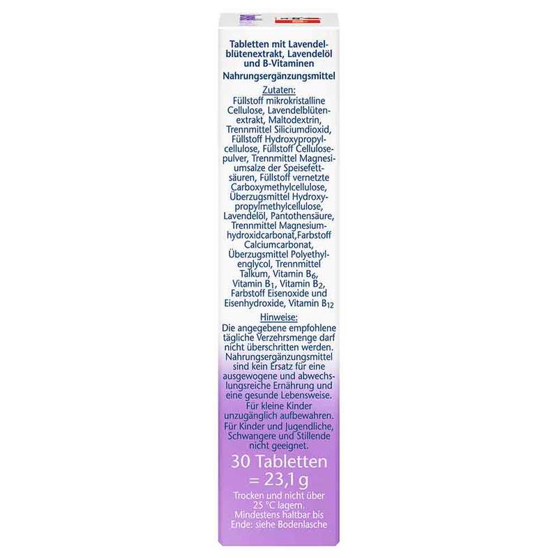 Füllstoff mikrokristalline Cellulose, Lavendelblütenextrakt, Maltodextrin, Trennmittel Siliciumdioxid, Füllstoff Hydroxypropylcellulose, Füllstoff Cellulosepulver, Trennmittel Magnesiumsalze der Speisefettsäuren, Füllstoff vernetzte Carboxymethylcellulose, Überzugsmittel Hydroxypropylmethylcellulose, Lavendelöl, Pantothensäure, Trennmittel Magnesiumhydroxidcarbonat, Farbstoff Calciumcarbonat, Überzugsmittel Polyethylenglycol, Trennmittel Talkum, Vitamin B6, Vitamin B1, Vitamin B2, Farbstoff Eisenoxide und Eisenhydroxide, Vitamin B12