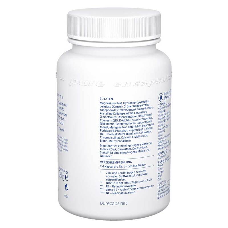 Magnesiumcitrat, Kapsel: Hydroxypropylmethylcellulose, Grüner-Kaffee-Extrakt (Svetol®), Füllstoff: mikrokristalline Cellulose, Alpha-Liponsäure (Thioctsäure), Ascorbinsäure, Zinkpicolinat, Coenzym Q10, D-Alpha-Tocopherolsuccinat, Niacinamid, Selenmethionin, Calciumpantothenat, Mangancitrat, natürliches Betacarotin, Pyridoxal-5-Phosphat, Kupfercitrat, Thiamin HCl, Vitamin D3 (Cholecalciferol), Riboflavin-5-Phosphat, (6S)-5-Methyltetrahydrofolat-Glucosaminsalz ([6S]-5-MTHF, Quatrefolic®), Chrompicolinat, Methylcobalamin, Biotin.