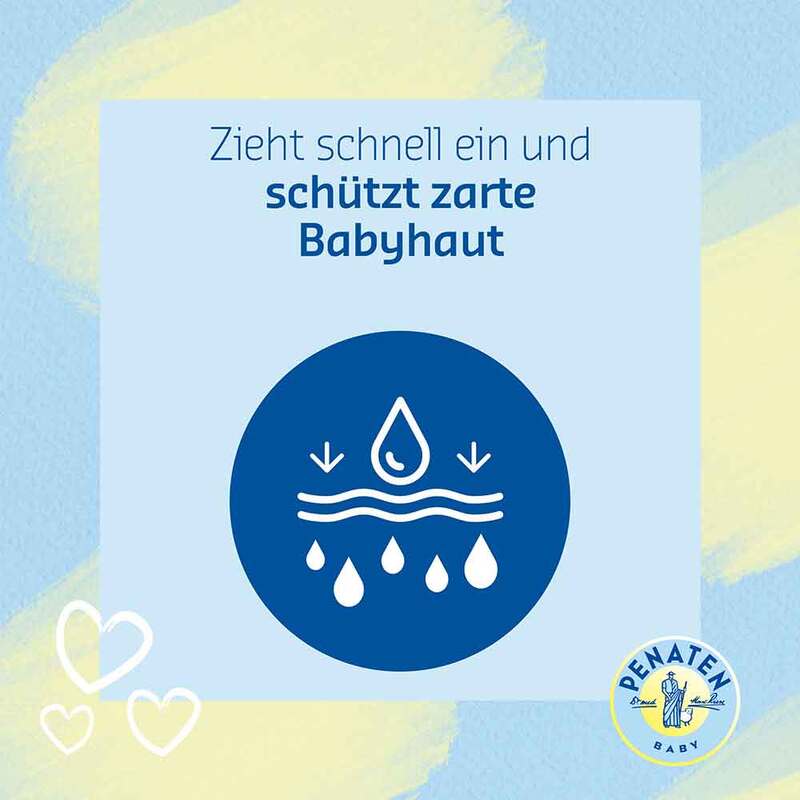 Die Penaten Baby Lotion zieht schnell ein und schützt die zarte Babyhaut. Sie hinterlässt ein angenehm weiches Hautgefühl, zudem ist die Hautverträglichkeit der Lotion dermatologisch bestätigt.
