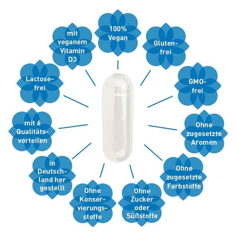 Nahrungsergänzungsmittel sind kein Ersatz für eine ausgewogene und abwechslungsreiche Ernährung und eine gesunde Lebensweise. Die angegebene empfohlene tägliche Verzehrmenge darf nicht überschritten werden. Das Produkt außerhalb der Reichweite von kleinen Kindern lagern.