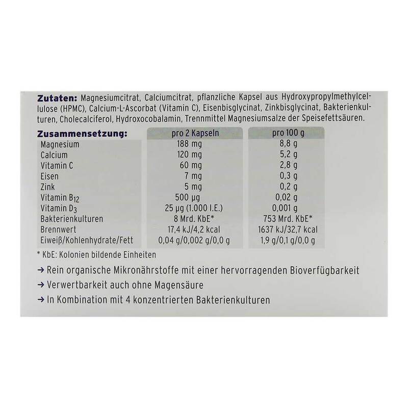 Magnesiumcitrat. Calciumcitrat, pflanzliche Kapsel aus Hydroxypropylmethylcellulose (HPMC), Calcium-L-Ascorbat (Vitamin C), Eisenbisglycinat, Zinkbisglycinat. Bakterienkulturen*, Cholecalciferol, Hydroxocobalamin, Trennmittel Magnesiumsalze der Speisefettsäuren.