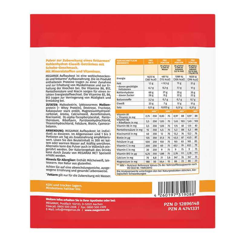Megamax Aufbaukost ist eine fettarme und leicht verzehrbare Aufbaunahrung mit vielen lebenswichtigen Nährstoffen. Die Aufbaunahrung enthält Eiweiß, Kohlenhydrate, Vitamine und Mineralstoffe. Die im Produkt enthaltenen Proteine tragen zu einer Zunahme und zur Erhaltung von Muskelmasse und zur Erhaltung normaler Knochen bei. Die Mineralstoffe Calcium und Magnesium sorgen zudem in Verbindung mit den Vitaminen B6, B12, Pantothensäure und Niacin für einen normalen Energiestoffwechsel. B-Vitamine unterstützen das Nervensystem und sorgen für normale psychische Funktionen. Biotin, Niacin, Riboflavin leisten einen Beitrag zur Erhaltung gesunder Schleimhäute. Hauptbestandteil der Aufbaunahrung sind Kohlenhydrate.