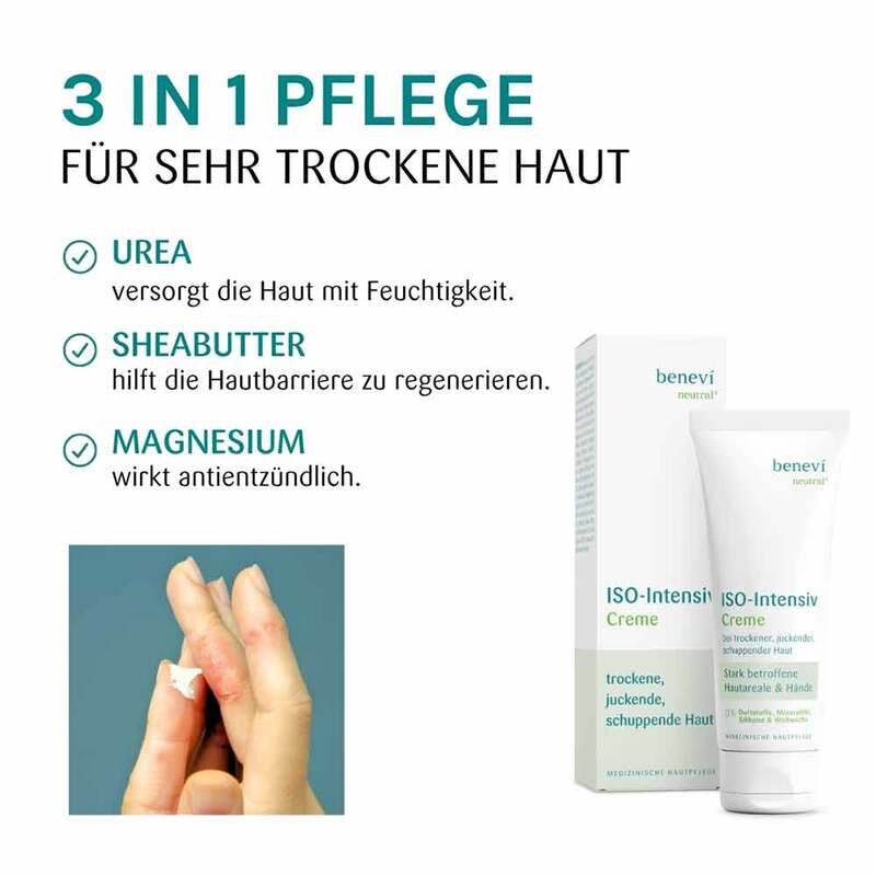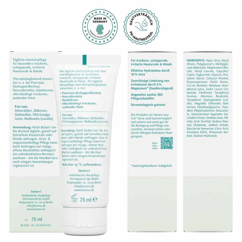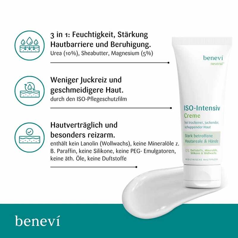 Benevi Neutral ISO-Intensivcreme ist eine Intensivpflege bei trockener, gereizter Haut – vielseitig einsetzbar bei Juckreiz & Schuppung – 10% Urea, 5% Magnesiumsalz.