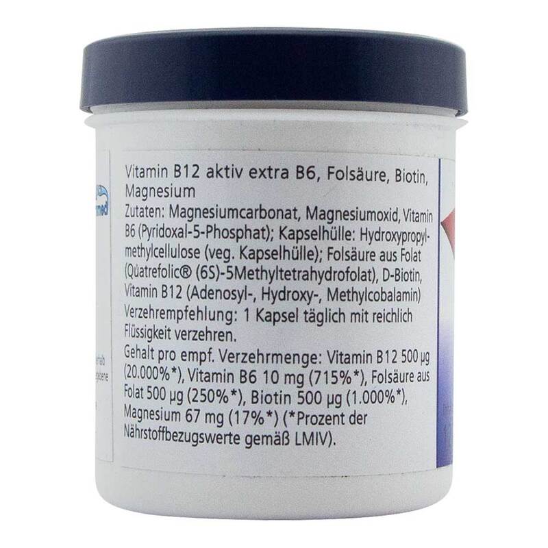 Magnesiumcarbonat, Magnesiumoxid, Vitamin B6 (Pyridoxal-5-Phosphat); Kapselhülle: Hydroxypropylmethylcellulose (veg. Kapselhülle); Folsäure aus Folat (Quatrefolic® (6S)-5Methyltetrahydrofolat), D-Biotin, Vitamin B12 (Adenosylcobalamin 200µg, Hydroxycobalamin 150 µg, Methylcobalamin 150 µg)Aufbewahrungshinweise