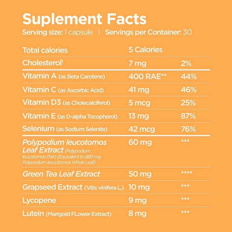 Gelatine, Sonnenblumenöl, Feuchthaltemittel (E 422), Polypodium leucotomos Poir Extrakt (7,8 %), Lycopin (1,0 %), Camellia sinensis L. Kuntze Extrakt (6,5 %), Emulgator (E 322), L-Ascorbinsäure (Vitamin C), Lutein (1,0 %), Verdickungsmittel (E 341), D- α-Tocopherol (Vitamin E), Triglyceride, ß-Carotin (Vitamin A), Vitis vinifera L. Extrakt (1,3 %), Emulgator (E 901), Farbstoff (E 172), Farbstoff (E 171), Cholecalciferol (Vitamin D), Natriumselenit (Selen).