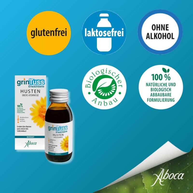 grinTUSS Erwachsene Hustensaft ist ein zu 100 % natürliches Produkt auf Basis von Honig und dem pflanzlichen Molekülkomplex Poliresin®. Dank seiner physiologischen Wirkung schützt er die oberen Atemwege und lindert deren Reizung. grinTUSS ist ohne Alkohol und glutenfrei mit einem angenehmen Geschmack. Seine Inhaltstoffe stammen dabei aus nachhaltigem und biologischem Anbau.