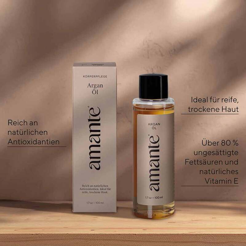Amante Arganöl ist ein ideales Hautpflegeöl zur täglichen Gesichts- und Körperpflege. Es enthält über 80 % ungesättigte Fettsäuren, ist reich an natürlichen Antioxidantien und sehr gut verträglich bei reifer und trockener Haut.