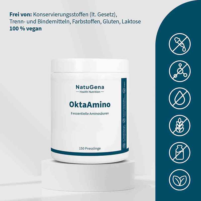 L-Leucin (19,6 %), L-Valin (16,6 %), L-Isoleucin (14,8 %), L-Lysin (14,3 %), L-Phenylalanin (12,9 %), L-Threonin (11,1 %), L-Methionin (7,0 %), L-Tryptophan (3,7 %).