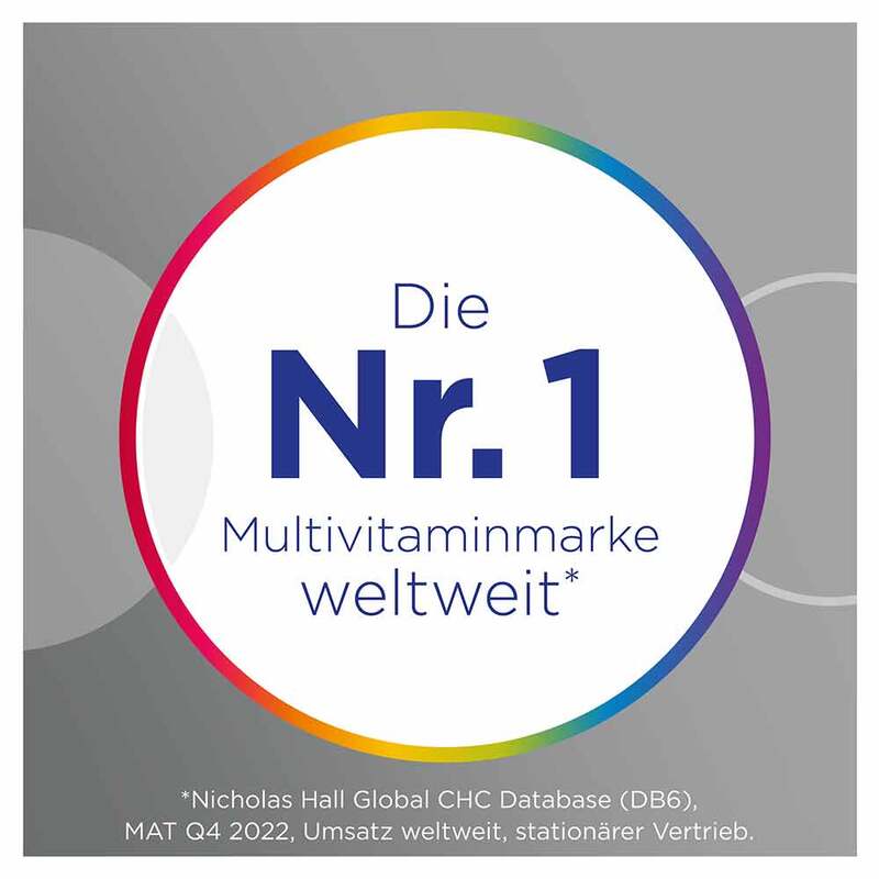 Calciumhydrogenphosphat; Magnesiumoxid; L-Ascorbinsäure; Füllstoffe: E 460, E 464, E 1200; Kaliumchlorid; Trennmittel: E 470b, E 551, E 553b, E 1202; DL-alpha-Tocopherylacetat; Nicotinamid; Calciumcarbonat; Calcium-D-Pantothenat; Eisen-II-fumarat; Zinkoxid; Mangan-II-sulfat; Beta-Carotin; Pyridoxinhydrochlorid; Thiaminmononitrat; Riboflavin; pflanzliche Öle (Kokos-, Palmkernöl); Kupfersulfat; D-Biotin; Retinylacetat; Pteroylmonoglutaminsäure; Chrom-III-chlorid; Natriummolybdat; Kaliumjodid; Natriumselenat; Phyllochinon; Cholecalciferol; Cyanocobalamin; Farbstoff: E 132.