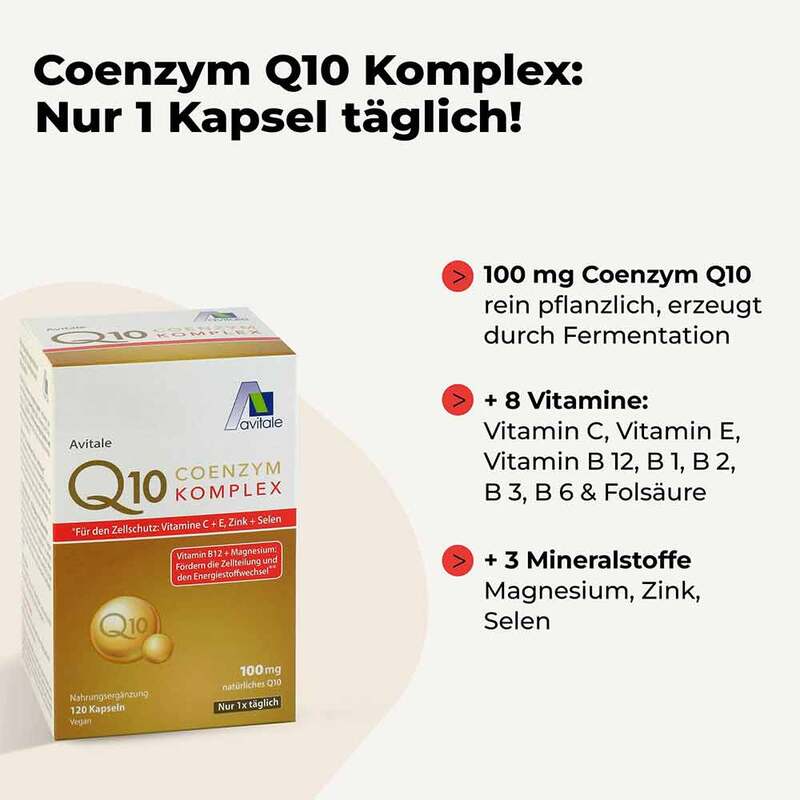 Avitale Q10 Coenzym Komplex Kapseln enthalten pro Kapsel 100 mg rein pflanzliches Q10, erzeugt durch Fermentation. Ergänzend sind 8 hochwertige Vitamine und 3 Mineralstoffe enthalten, die für das menschliche Wohlbefinden wertvoll sind.