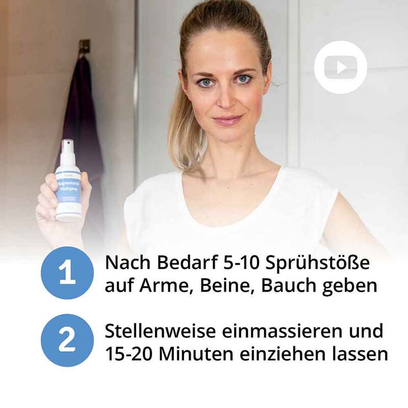 Massieren Sie täglich 5-20 Sprühstöße auf Arme, Beine und oder Bauch sanft ein und lassen es mindestens 15-20 Minuten einziehen. Bei Bedarf tupfen Sie es hinterher ab.