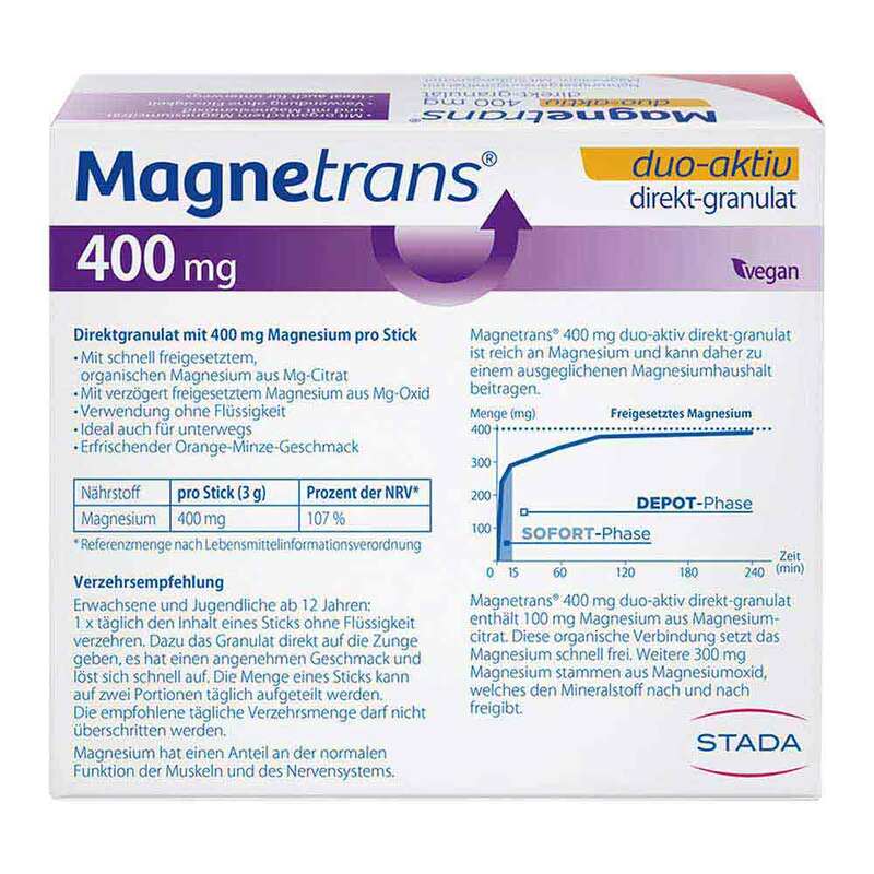 Das neue Nahrungsergänzungsmittel Magnetrans® 400 mg duo-aktiv von STADA ist ein hochdosiertes Direktgranulat. Es enthält 100 mg Magnesium aus schnell freisetzendem Magnesiumcitrat für die sofortige Magnesiumversorgung – vorteilhaft für die schnelle Regeneration. Weitere 300 mg Magnesium stammen aus langsam freisetzendem Magnesiumoxid für die kontinuierliche Magnesiumversorgung – vorteilhaft für das Auffüllen der Magnesiumdepots.