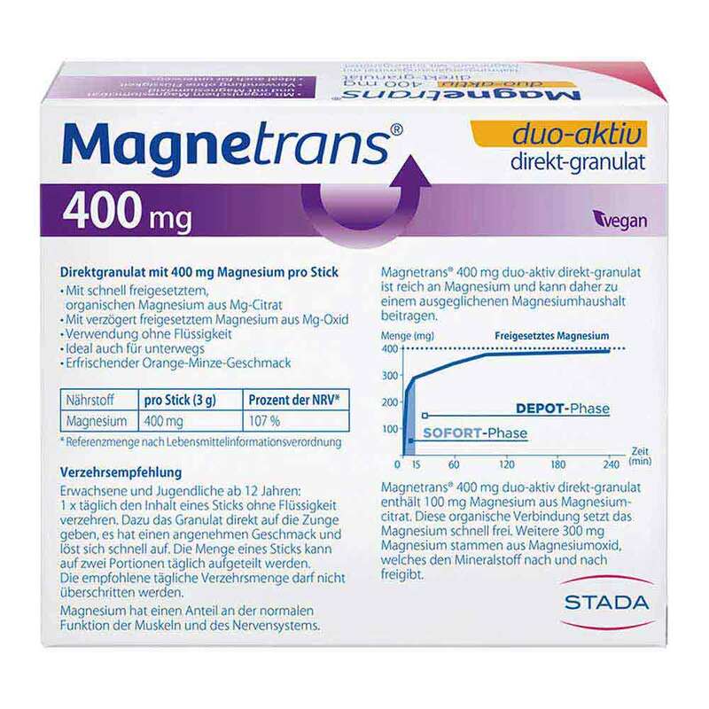 Das neue Nahrungsergänzungsmittel Magnetrans® 400 mg duo-aktiv von STADA ist ein hochdosiertes Direktgranulat. Es enthält 100 mg Magnesium aus schnell freisetzendem Magnesiumcitrat für die sofortige Magnesiumversorgung – vorteilhaft für die schnelle Regeneration. Weitere 300 mg Magnesium stammen aus langsam freisetzendem Magnesiumoxid für die kontinuierliche Magnesiumversorgung – vorteilhaft für das Auffüllen der Magnesiumdepots.