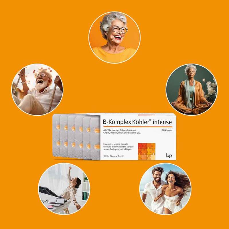 Neben allen Vitaminen des B-Komplexes enthält das Nahrungsergänzungsmittel B-Komplex Köhler®intense die vier vitaminähnlichen Substanzen Cholin, Inositol, PABA und Coenzym Q10. Die Art und Dosierung dieser zwölf ausgewählten Mikronährstoffe bieten eine gute Voraussetzung für eine intensive ernährungsphysiologische Wirkung.