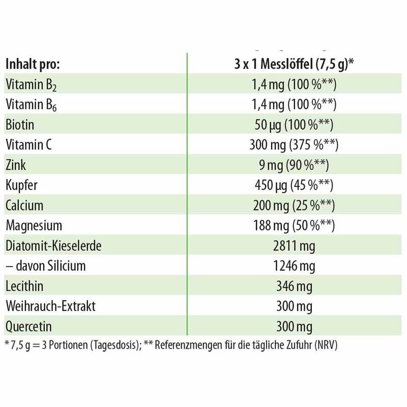• Mikronisierte Diatomit-Kieselerde, Weihrauch-Extrakt, Quercetin & Lecithin