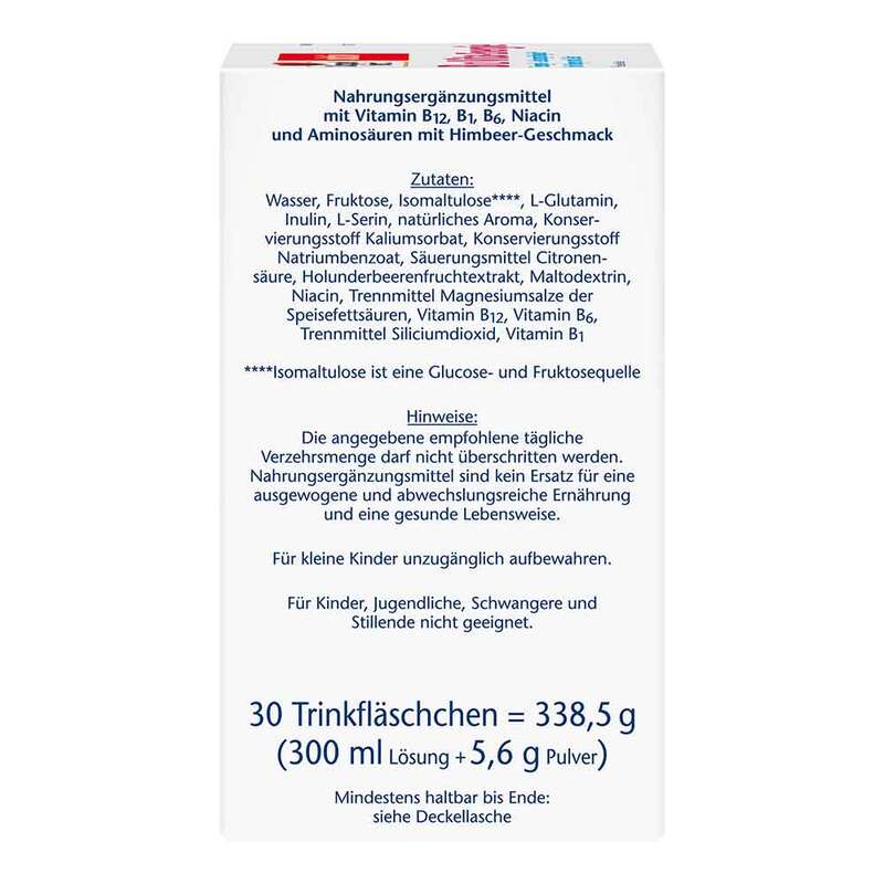 Wasser, Fruktose, Isomaltulose****, L-Glutamin, Inulin, L-Serin, natürliches Aroma, Konservierungsstoff Kaliumsorbat, Konservierungsstoff Natriumbenzoat, Säuerungsmittel Citronensäure, Holunderbeerenfruchtextrakt, Maltodextrin, Niacin, Trennmittel Magnesiumsalze derSpeisefettsäuren, Vitamin B12, Vitamin B6, Trennmittel Siliciumdioxid, Vitamin B1