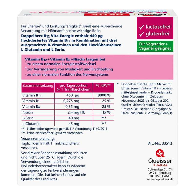 Für Gesundheit, Energie und Leistungsfähigkeit spielt eine ausreichende Versorgung mit Nährstoffen eine wichtige Rolle. Doppelherz B12 Vita-Energie enthält 200 μg hochdosiertes Vitamin B12 in Kombination mit drei ausgesuchten B-Vitaminen und den Eiweißbausteinen L-Glutamin und L-Serin.