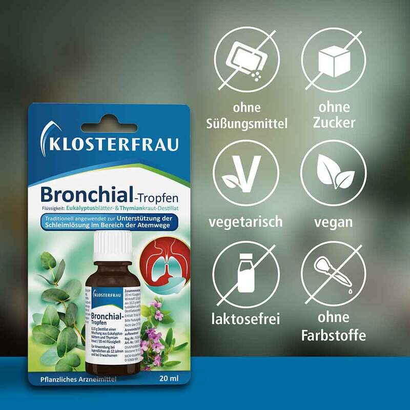 Klosterfrau Bronchial-Tropfen. Wirkstoff: Destillat einer Mischung aus Eukalyptusblätten und Thymiankraut. Anwendungsgebiete: Klosterfrau Bronchial-Tropfen werden traditionell angewendet zur Unterstützung der Schleimlösung im Bereich der Atemwege. Traditionelles pflanzliches Arzneimittel zur Anwendung zur Unterstützung der Schleimlösung im Bereich der Atemwege, ausschließlich aufgrund langjähriger Anwendung. Warnhinweis: Enthält 70 Vol.-% Alkohol und Cineol. Packungsbeilage beachten. Zu Risiken und Nebenwirkungen lesen Sie die Packungsbeilage und fragen Sie Ihre Ärztin, Ihren Arzt oder in Ihrer Apotheke.