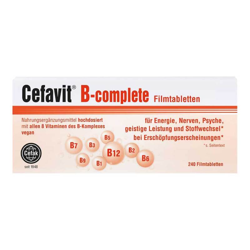 In ausgewogener Kombination liefert Cefavit® B-complete alle 8 lebenswichtigen Vitamine des B-Komplexes, die der Körper täglich braucht. Für die Komplettversorgung genügt Erwachsenen und Jugendlichen ab 15 Jahren nur 1 Filmtablette täglich. Vor der Einnahme sollten Schwangere und Stillende mit ihrem Arzt Rücksprache halten.