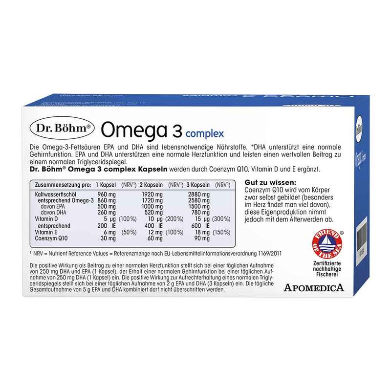 Dr. Böhm Omega 3 complex Kapseln enthalten 870 mg Omega-3-Fettsäuren entsprechend 750 mg EPA und DHA aus hochwertigem, schadstoffgeprüftem Kaltwasserfischöl pro Kapsel. EPA und DHA leisten einen Beitrag zu einem normalen Triglyceridspiegel sowie einer normalen Herzfunktion. DHA unterstützt eine normale Gehirnfunktion. Die Innovation der magensaftstabilen Kapseln: Sie sorgen dafür, dass die Omega-3-Fettsäuren geruchs- und geschmacksfrei erst im Darm freigesetzt werden.