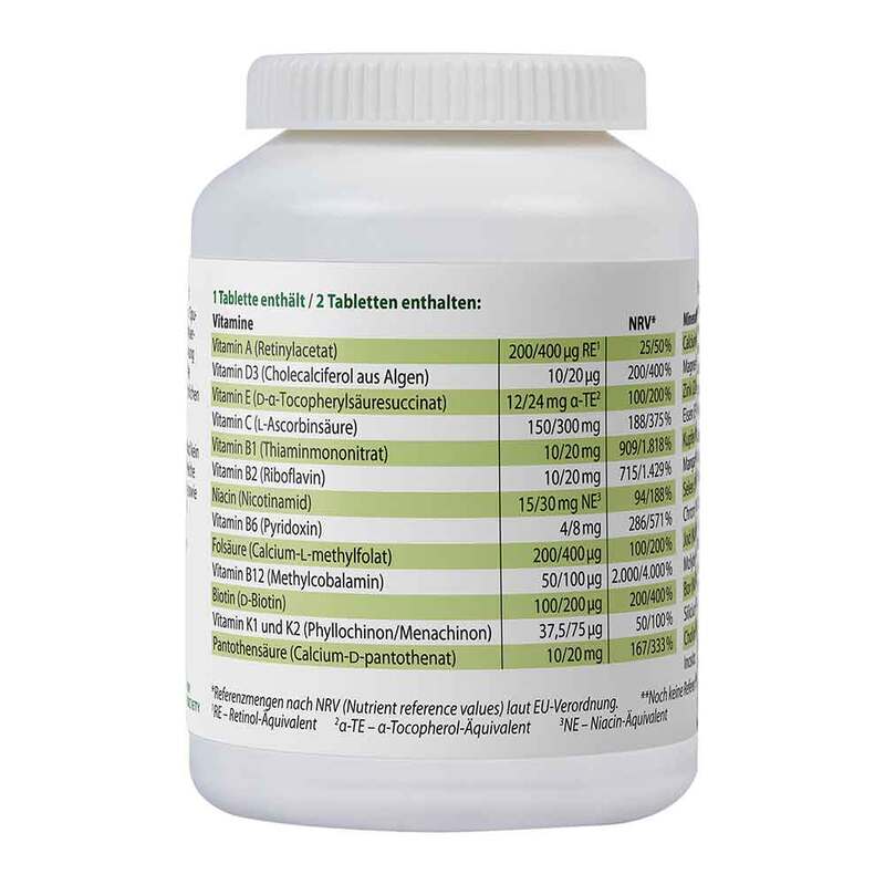 Trennmittel: mikrokristalline Cellulose; Calcium, Vitamin C, Cholin, Überzugsmittel: Hydroxypropylmethylcellulose, Hydroxypropylcellulose, Calciumcarbonat, mikrokristalline Cellulose, Speisefettsäuren, Spirulina, Apfel, Färberdistel, Zitrone; Magnesium, Eisen, Selen, Silizium, Inositol, Zink, Niacin, Vitamin E, Vitamin B1, Bor, Pantothensäure, Vitamin B2, Trennmittel: Speisefettsäuren, Magnesiumsalze der Speisefettsäuren; Vitamin K2, Vitamin D3, Vitamin B6, Vitamin A, Mangan, Kupfer, Vitamin K1, Chrom, Folsäure, Biotin, Jod, Vitamin B12, Molybdän.