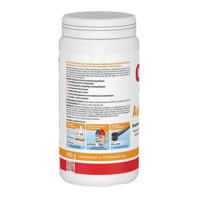 MEGAMAX Aufbaukost ist individuell zu dosieren. Im Allgemeinen sind 1 bis 3 Portionen am Tag als Zusatznahrung empfehlenswert. Lösen Sie den Beutelinhalt in 300ml kaltem oder warmen Wasser auf. Kräftig umrühren. Alternativ kann das Pulver auch in Vollmilch eingerührt werden.