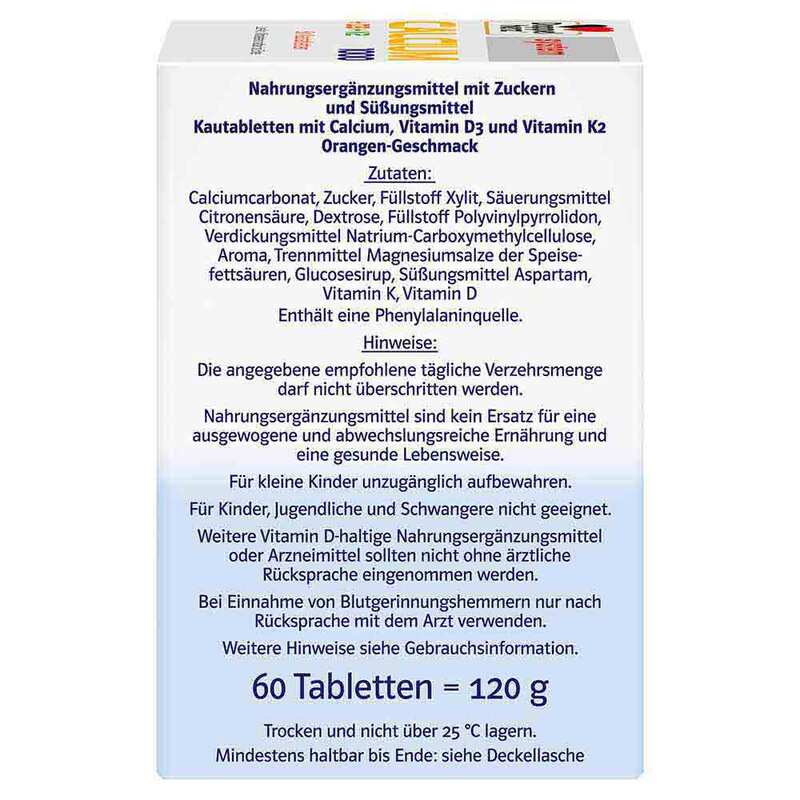 Nahrungsergänzungsmittel mit Calcium, Vitamin D3 und Vitamin K2 Orangen-Geschmack. Mit Zuckern und SüßungsmittelZutaten