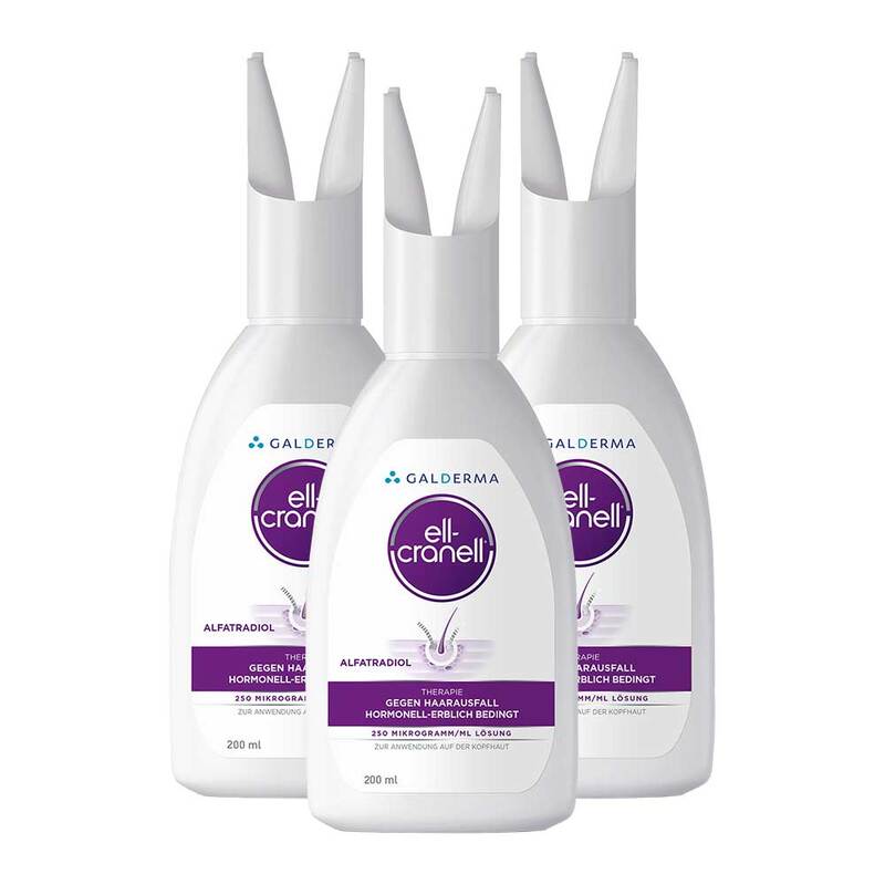 Ell-Cranell 250 Mikrogramm/ml. Wirkstoff: Alfatradiol. Anwendungsgebiete: Zur Steigerung der verminderten Anagenhaarrate bei der leichten androgenetischen Alopezie (hormonell-erblich bedingter Haarausfall) bei Männern und Frauen. Zu Risiken und Nebenwirkungen lesen Sie die Packungsbeilage und fragen Sie Ihren Arzt oder Apotheker.
