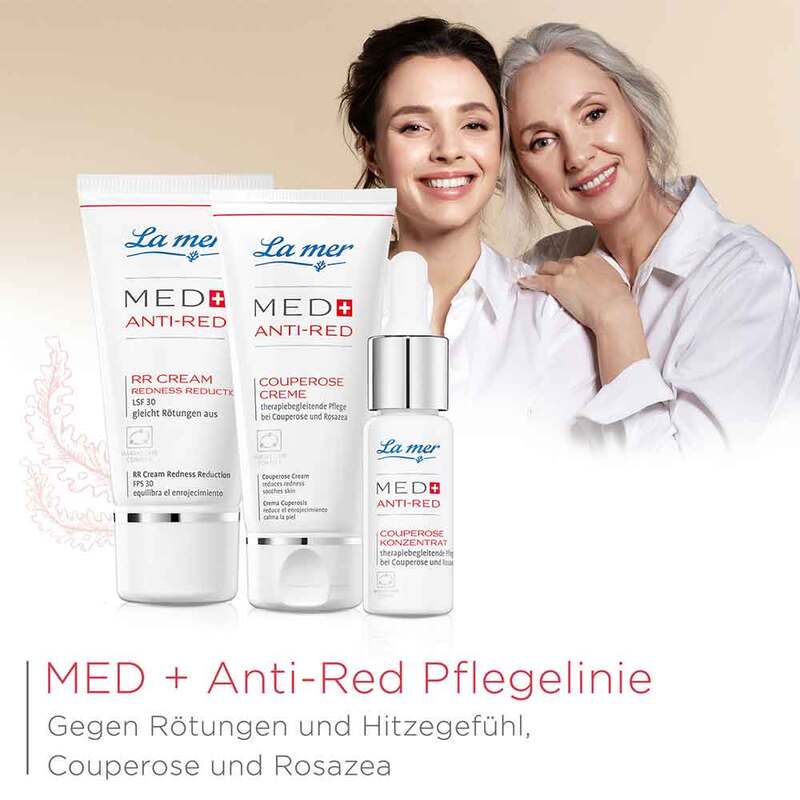 In Med+ Anti-Red wirkt der Marine Care Complex aus Meeresschlick-Extrakt, Grünalgenextrakt und Meersalz mit zusätzlichen Wirkstoffen für spezifische Bedürfnisse gereizter Haut mit vorübergehender oder dauerhafter Rötung. Die La mer Med+ Anti-Red Produkte bieten dank der Kraft des Meeres therapiebegleitende Pflege bei zu Couperose und zu Rosazea neigender Haut. So werden Hautirritationen gemildert und Rötungen kaschiert.
