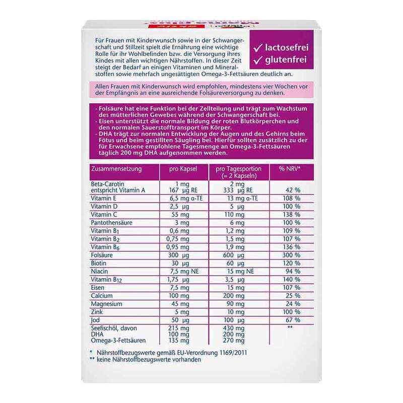 * Folsäure und Eisen haben eine Funktion bei derZellteilung. Folsäure trägt zum Wachstum des mütterlichen Gewebes während derSchwangerschaft bei. Eisen trägt zur normalen Bildung von roten Blutkörperchen und Hämoglobin bei. Eisen trägt zu einem normalen Sauerstofftransport im Körper bei. Die mütterliche Zufuhr von DHA trägt zur normalen Entwicklung des Gehirns des Fötus und des gestillten Säuglings bei (der positive Effekt stellt sich ein, wenn 0,2 g DHA plus die empfohlene tägliche Zufuhr von Omega-3-Fettsäuren (EPA+DHA für Erwachsene, d.h. 0,25 g pro Tag) eingenommen werden). Die Aufnahme von DHA durch die Mutter trägt zur normalen Entwicklung der Augen des Fötus und des gestillten Säuglings bei (der positive Effekt setzt ein, wenn 0,2 g DHA plus die empfohlene tägliche Zufuhr von Omega-3-Fettsäuren (EPA+DHA) für Erwachsene, die 0,25 g pro Tag beträgt, eingenommen werden).