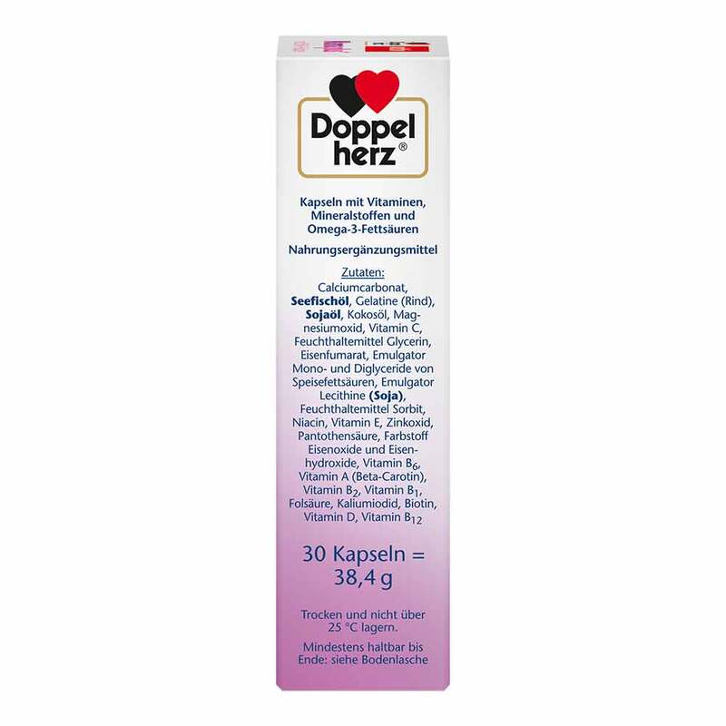 Calciumcarbonat, SEEFISCHÖL, Gelatine (Rind), SOJAÖL, Kokosöl, Magnesiumoxid, Vitamin C, Feuchthaltemittel Glycerin, Eisenfumarat, Emulgator Mono- und Diglyceride von Speisefettsäuren, Emulgator Lecithine (SOJA), Feuchthaltemittel Sorbit, Niacin, Vitamin E, Zinkoxid, Pantothensäure, Farbstoff Eisenoxide und Eisenhydroxide, Vitamin B6, Vitamin A (Beta-Carotin), Vitamin B2, Vitamin B1, Folsäure, Kaliumiodid, Biotin, Vitamin D, Vitamin B12.