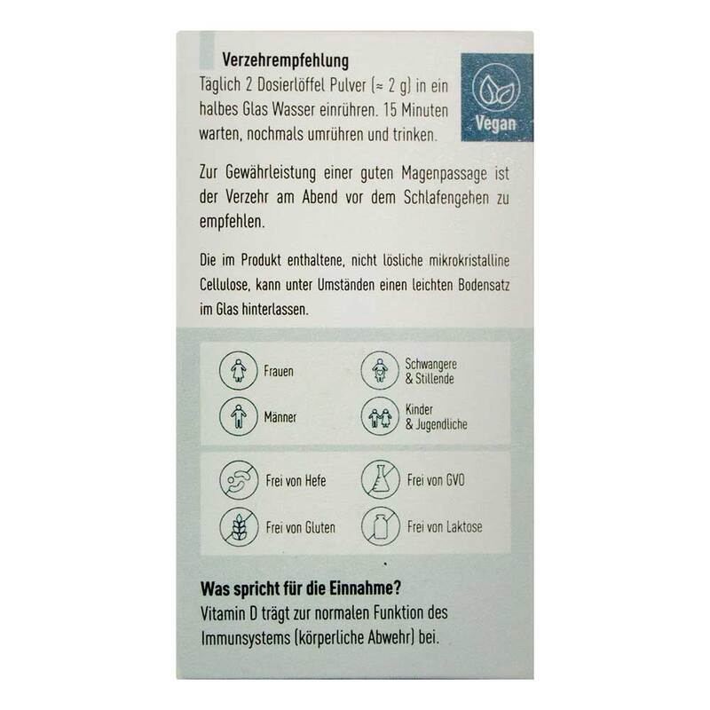 2 g Pulver pro Tag – 2 Dosierlöffel – mit einem Plastiklöffel in ein halbes Glas Wasser oder Saft einrühren und 15 Minuten stehen lassen. Abschließend umrühren und trinken. Zur Gewährleistung einer guten Magenpassage ist der Verzehr am Abend vor dem Schlafengehen zu empfehlen.
