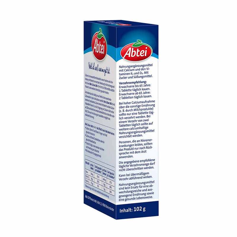 Der Knochen baut sich ständig neu auf. Hierfür ist eine ausreichende Calciumzufuhr in jeder Lebensphase essentiell. Abtei Calcium 1400 kombiniert hochdosiertes Calcium sinnvoll mit Vitamin K und dem Calcium-Einbauhelfer Vitamin D, das die Einlagerung von Calcium in die Knochen und Zähne und damit eine normale Knochendichte bis ins hohe Alter unterstützt. Die neue Formulierung der Kautablette ermöglicht eine individuelle Dosierung.