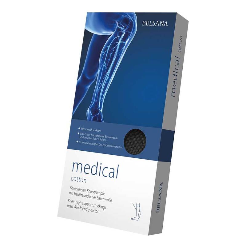 Bei den BELSANA medical cotton handelt es sich um kompressive Kniestrümpfe. Sie vereinen zahlreiche Vorteile: Sie verhindern geschwollene Füße sowie Beine, schützen vor Krampfadern und Besenreisern und wirken vorbeugend gegen Thrombosen. Dabei zeichnen sich die Strümpfe durch ihre medizinische Wirksamkeit aus. Sie sind hautfreundlich dank natürlicher Baumwolle und schenken Ihnen ein weiches Tragegefühl – sowohl für die Frau als auch den Mann!