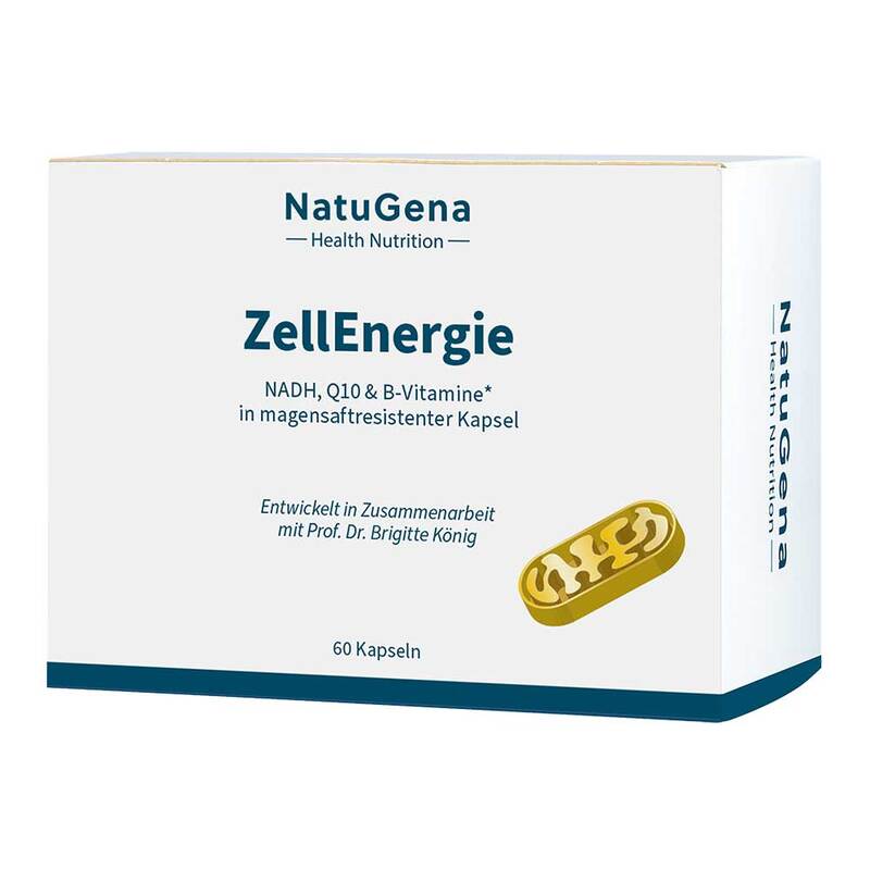 Ubichinon, Magnesiumtaurat, magensaftresistente Kapselhülle: Hydroxypropylmethylcellulose (HPMC); R-Alpha-Liponsäure, Nicotinamid, Riboflavin-5-Phosphat, Staudenknöterich-Extrakt, Nicotinsäureamid-Adenin-Dinukleotid, Thiaminhydrochlorid, Eisen-II-Fumarat, Kupfer-II-Gluconat.